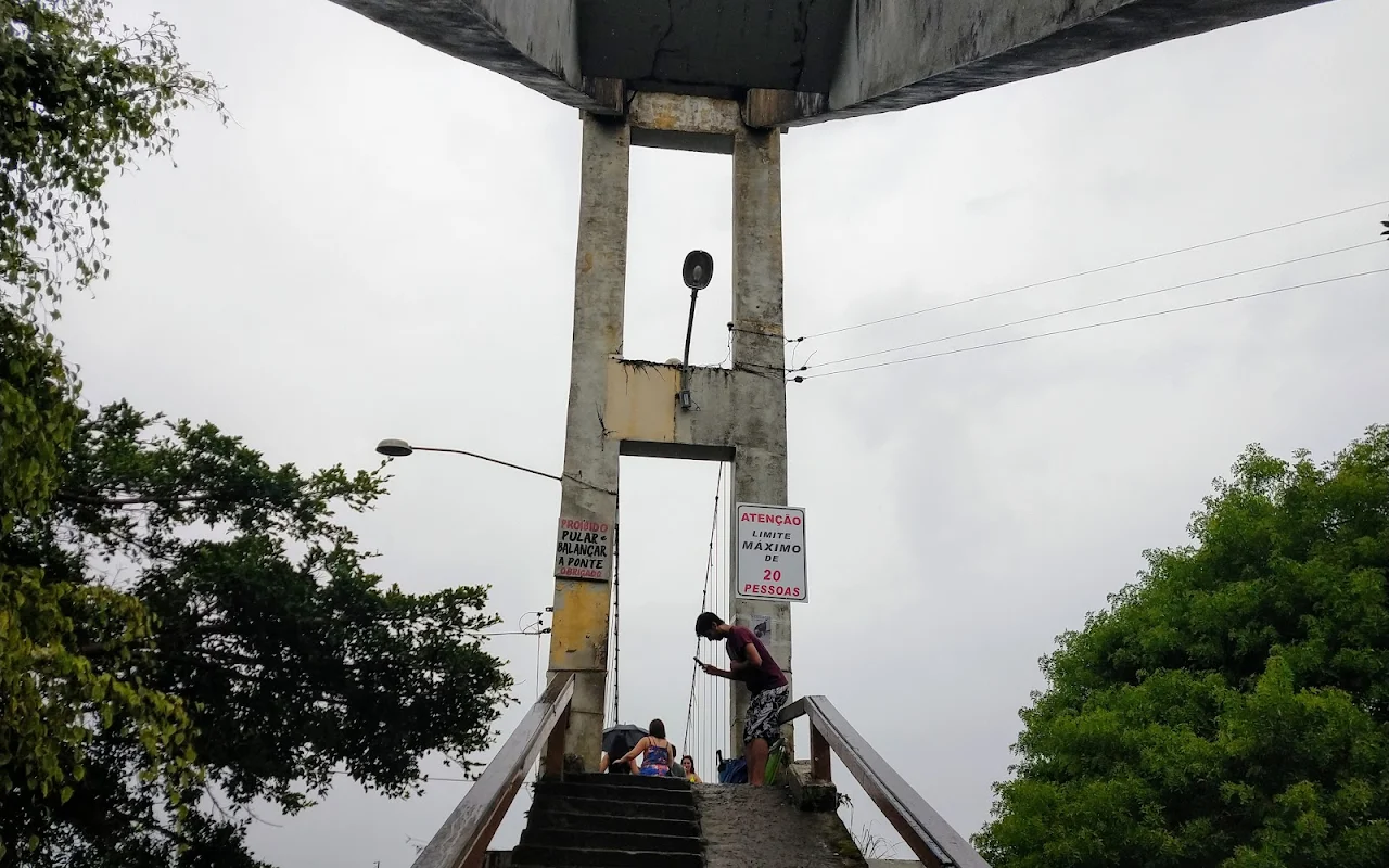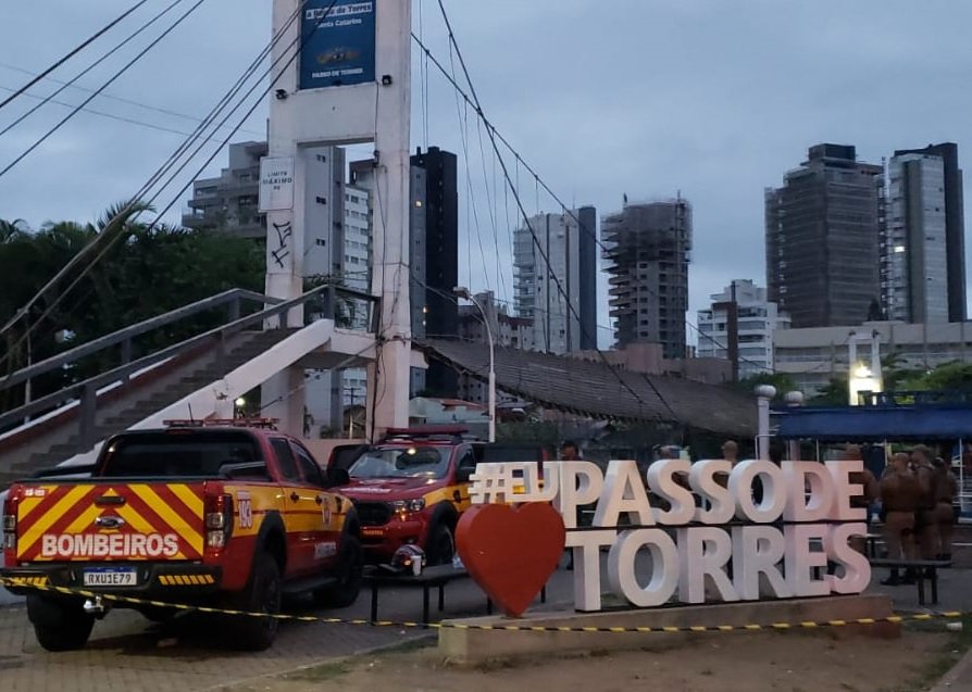 Um dos cabos de sustentação de uma ponte pênsil rompeu durante a madrugada desta segunda-feira (20) diversas pessoas caíram no Rio Mampituba. A ponte é utilizada por pedestres para atravessar a fronteira entre Torres (RS) e Passo de Torres (SC).